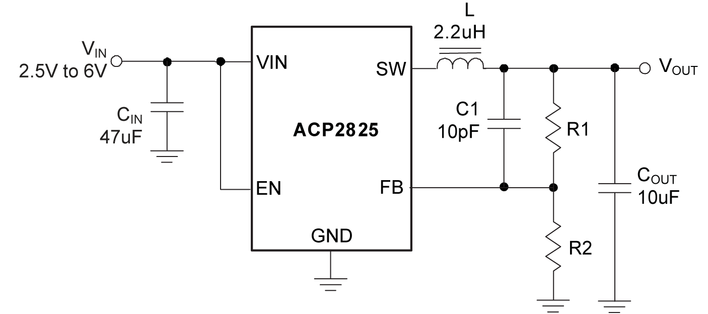 The ACP2825 is a high-efficiency, DC-to-DC step-down switching regulators, capable of delivering up to 1.2A of output current. The device operates from an input voltage range of 2.5V to 6V and provides an output voltage from 0.6V to VIN, making the ACP2825 ideal for low voltage power conversions. Running at a fixed frequency of 1.5MHz allows the use of small external components, such as ceramic input and output caps, as well as small inductors, while still providing low output ripples. This low noise output along with its excellent efficiency achieved by the internal synchronous rectifier, making ACP2825 an ideal green replacement for large power consuming linear regulators. Internal soft-start control circuitry reduces inrush current. Short-circuit and thermal-overload protection, input over voltage and input under voltage lockout protection improves design reliability. The device is available in SOT25 package.