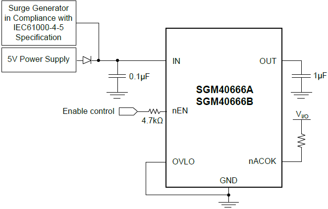 When the OVLO input is set below the external OVLO select threshold (0.27V TYP), the SGM40666A and SGM40666B automatically choose the internal trip thresholds that are preset to 6.83V typically. SGMICRO provides customized OVP threshold options for 22.2V/15.3V/10.5V/6.35V/5.95V. Please contact us if necessary.