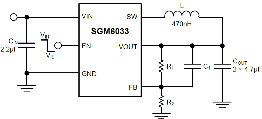The SGM6033 is a 4.6MHz, synchronous step-down switching voltage regulator, with 1A output current capability, that delivers adjustable output from an input voltage supply of 2.5V to 5.5V. Using an architecture with synchronous rectification, the SGM6033 is capable of delivering a peak efficiency of 90%, while maintaining efficiency over 80% at load currents as low as 1mA.