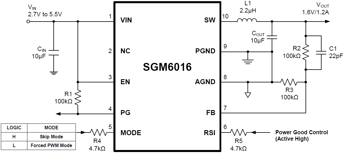 SGM6016 is a 1.2A, 1.6MHz step-down regulator, which is ideal for powering low-voltage microprocessors in compact devices such as GPS and cellular phones. It is optimized for generating low output voltages down to 0.8V. The supply voltage range is from 2.7V to 5.5V allowing the use of a single Li+ cell, three NiMH cells or a regulated 5V input. 1.6MHz pulse-width modulation (PWM) switching frequency allows using small external components. It has flexible operation mode selection of forced PWM mode and skip (low IQ) mode with typical 30μA quiescent current for highest light load efficiency to maximize battery life. The SGM6016 integrates a pair of low on-resistance P-Channel and N-Channel MOSFETs to maximize efficiency and minimize external component count.