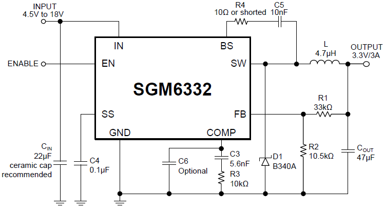 The SGM6332 is available in Green SOIC-8 (Exposed Pad) package and requires a minimum number of readily available external components to complete a 3A step-down DC/DC converter solution.