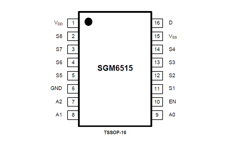 The SGM6515 is a high speed monolithic 8:1 analog signal multiplexer. The SGM6515 switches one of 8 inputs to a common output, as determined by the 3-bit binary address lines (A0, A1 and A2). An EN input enables or disables the device. When disabled, all channels switch off; when enabled, each channel conducts equally well in both directions and has an input signal range that extends to the supplies.