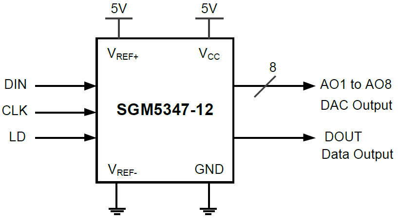 The SGM5347-12 features 8 channels of 12-bit digital-to- analog converter (DAC) with output amplifiers. The output amplifier provides high current drive capability. The digital data is input via a serial link bus. Only three control lines are required, and cascaded connections can be used.