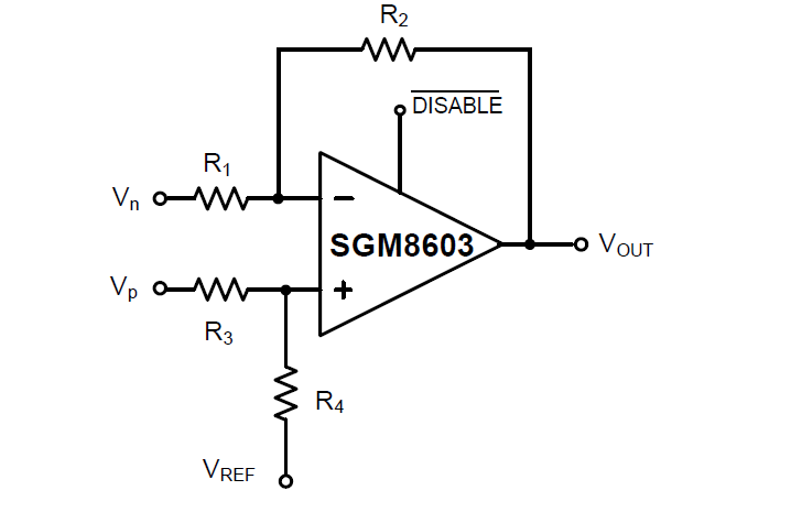 The SGM8603 (single with shutdown) is a low noise, low voltage and low power operational amplifier that can be designed into a wide range of applications. The SGM8603 has a high gain-bandwidth product of 11MHz, a slew rate of 8.5V/μs, and a quiescent current of 1.1mA at 5V. The SGM8603 has a power-down disable feature that reduces the supply current to less than 1μA.