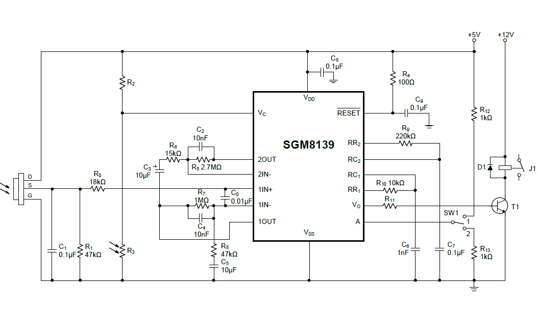 Many industrial and building automation systems use motion detectors to control different functions based on human presence. Using SGM8139 with proper PIR sensor, it is easy to build a compact passive infrared detection system. The output stage of SGM8139 can easily drive different types of lights, buzzers, automatic doors, fans and white goods with programmable timers.