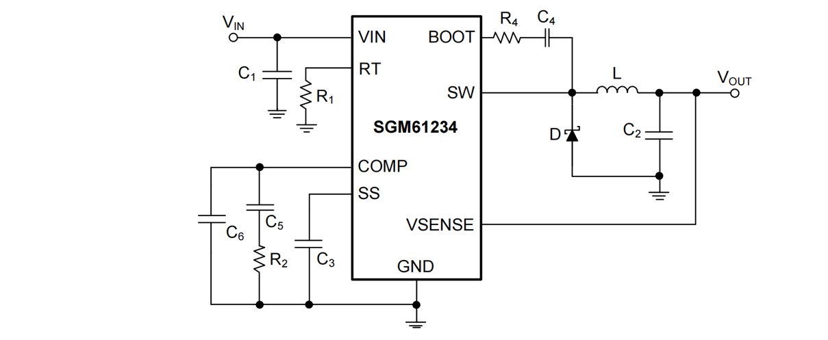 The SGM61234 is a 5V fixed output, non-synchronous Buck converter with a wide input voltage range from 6.5V to 28V and 2A output current capability. This device uses peak current mode control with slope compensation. Pulse skip mode (PSM) feature is included to reduce losses at the light loads.