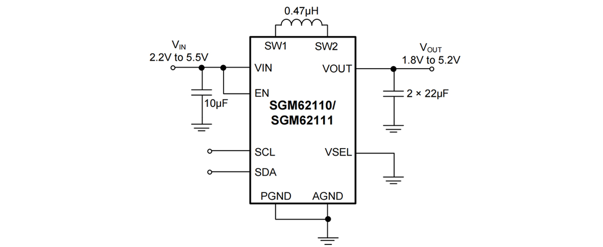 The SGM62110 and SGM62111 are available in a small WLCSP-2.21×1.40-15B package. High integration provides a compact solution with only four external components, allowing implementation in a PCB area as small as 39mm2.