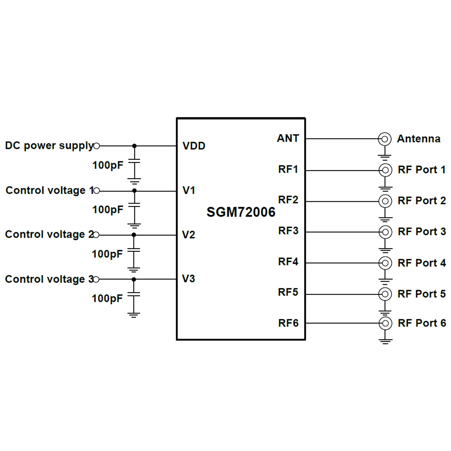 The SGM72006 has the ability to integrate SP6T RF switch and GPIO controller on a SOI chip. Internal driver and decoder for switch control signals are offered by the GPIO controller, which makes it flexible in RF path band and routing selection.No external blocking capacitor requirements on the RF paths as long as no external DC voltage is applied which can save PCB area and cost.