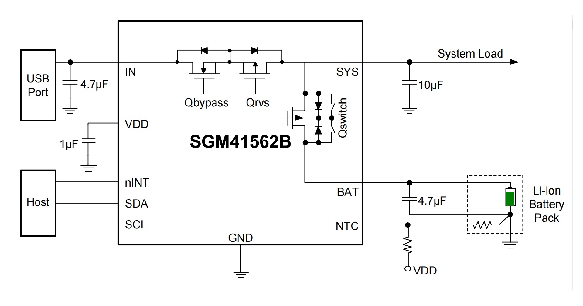 The SGM41562A and SGM41562B are highly integrated, I2C programmable, single-cell Li-Ion or Li-polymer battery chargers with system power path management. They are specifically designed for portable applications requiring minimum board space and small external components. The charging profile includes pre-charge, constant-current and constant-voltage phases. Several safety and protection features are included such as built-in safe charge timer to set maximum duration of charge and pre-charge, input voltage and current monitoring, internal (junction) and external (battery) temperature monitoring, input current limiting and load current limiting. SGM41562A can charge with a wide input voltage range of up to 18V compared to the SGM41562B which has 5.75V charging range, but the rest of their functions are the same.