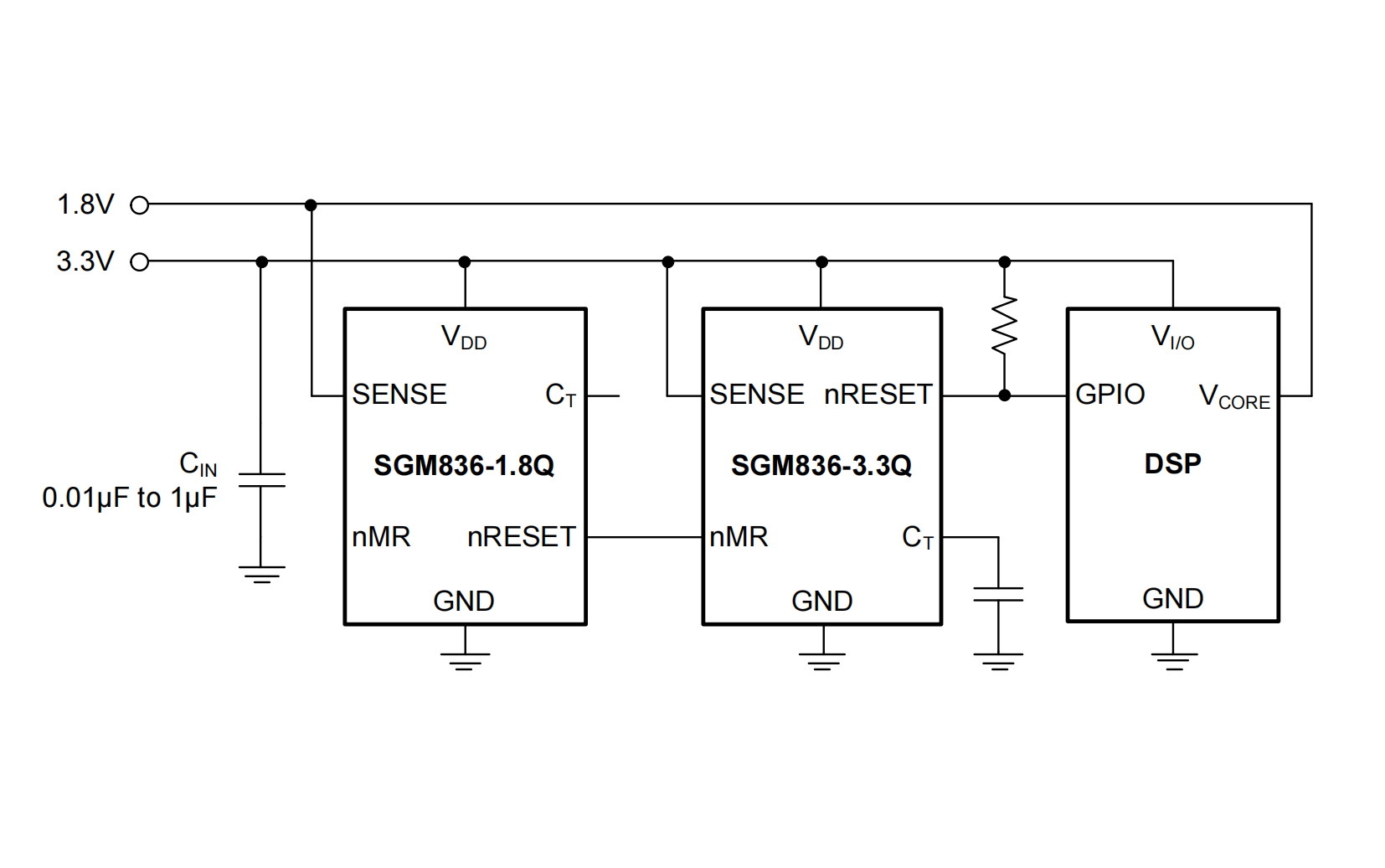 The SGM836xQ family can monitor system voltages from 0.4V to 5V. When the detection voltage falls below the preset threshold (VITL) or the manual reset (nMR) pin is driven low, the open-drain nRESET output is asserted. After the detection voltage and nMR voltage return higher than their respective thresholds, the nRESET output remains low within the user-adjustable delay time.