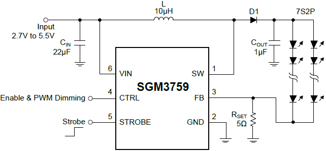 With a 40V rated integrated switch FET, the SGM3759 is a boost converter that drives LEDs in series. The boost converter has a 40V, 3A internal MOSFET; thus it can drive single or parallel LED strings for small to large size panel backlighting. And it is quite suitable for smart phone image capture using display device as a flash mode light source, as it can output up to 200mA current at 30V for 320ms when the strobe signal is active.