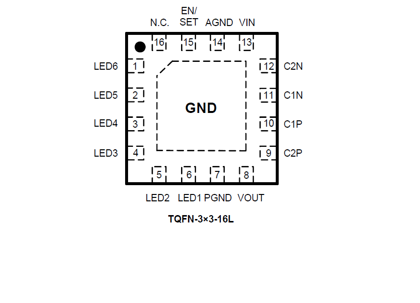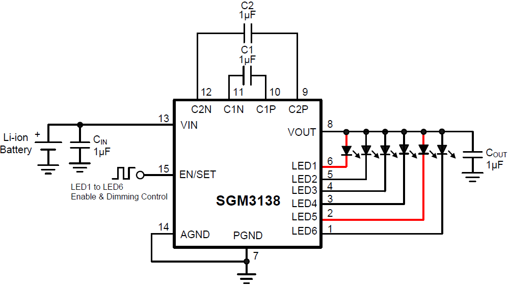 The SGM3138 supports up to 6 white LEDs and regulates a constant current which the initial value can be set by an internal resistor. The part implements a 4-bit DAC for brightness control. Users can easily configure the LED current from 1.25mA to 20mA by a serial pulse. The dimming of white LEDs current can be achieved by applying a pulse signal to the EN/SET pin. There are totally 16 steps of current could be set by users. The operating voltage range is 2.7V to 5.5V. Internal soft-start circuitry effectively reduces the in-rush current while both start-up and mode transition.
