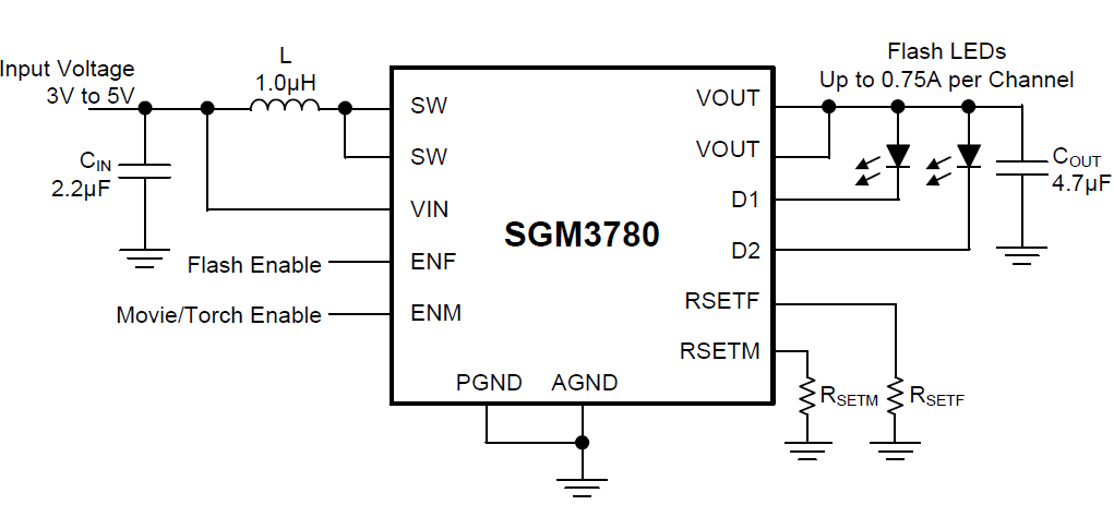 The two LED output sinks can be shorted together externally for higher power single flash LEDs, up to 1.5A continuous LED current. Thermal regulation is integrated in Flash mode to limit the IC’s temperature and continuously provide the maximum allowed output current. Various protection features are built into the SGM3780, including cycle-by-cycle input current limit protection, output over-voltage protection, LED fault (open or short) protection and thermal shutdown protection. The leakage current in shutdown is less than 1μA.